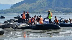 The incident, in the shallow muddy waters of Golden Bay, at the northwest tip of South Island, was New Zealand's largest known whale stranding since 1985, when 450 of the animals were stranded in Auckland, and the third largest on record.